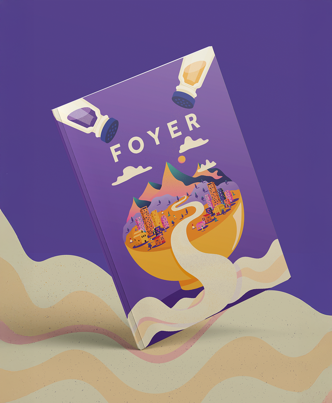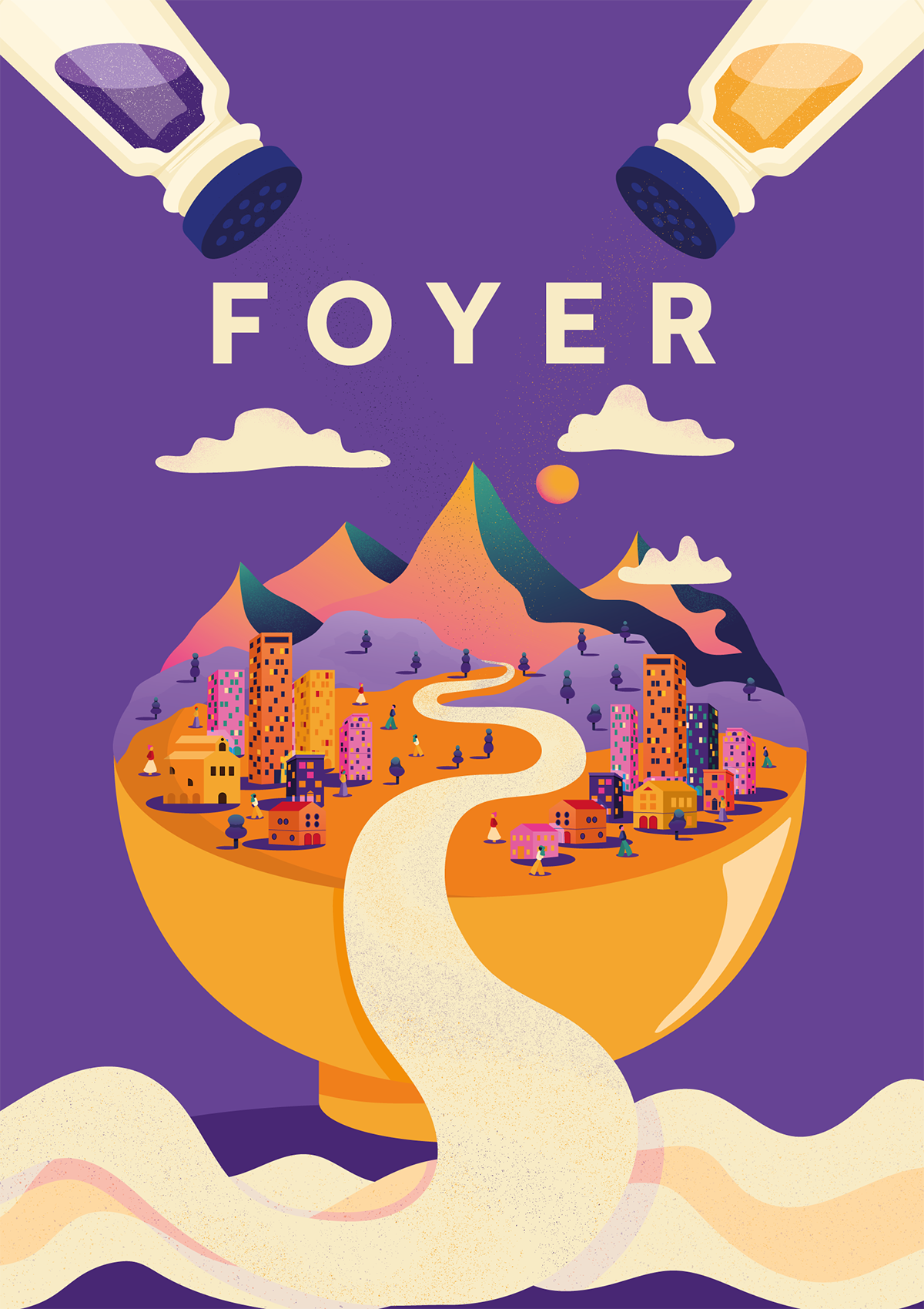 For their 4th issue on Food, I created a series of illustrations for the magazine cover, back, and chapter headings. Each chapter is categorized as a different course in a menu. The concept in this illustration series was mixing two different origins, serving as a metaphor for the individuals with mixed cultural heritage that FOYER interviews. The mixing is visualized in many ways: different colors, different landscapes, different sprinkles, different sauces, different ingredients. All of them mixing and interspersing, adapted to elements and processes of food culture.