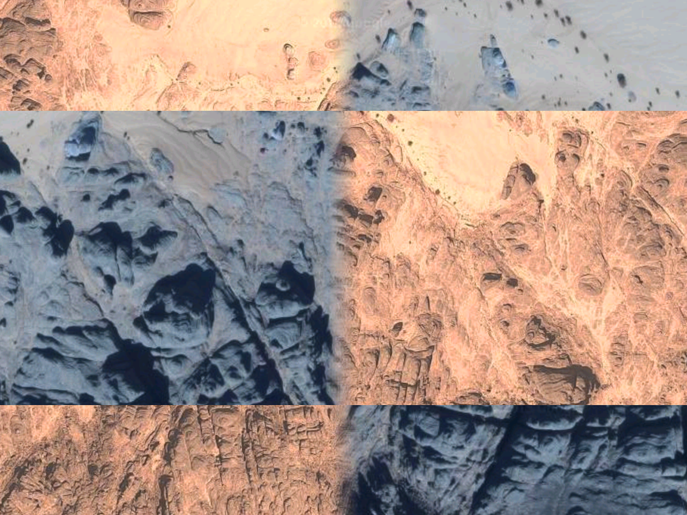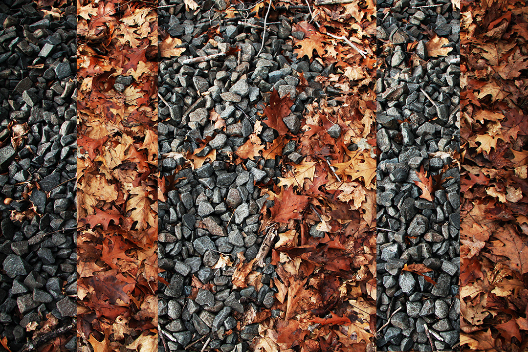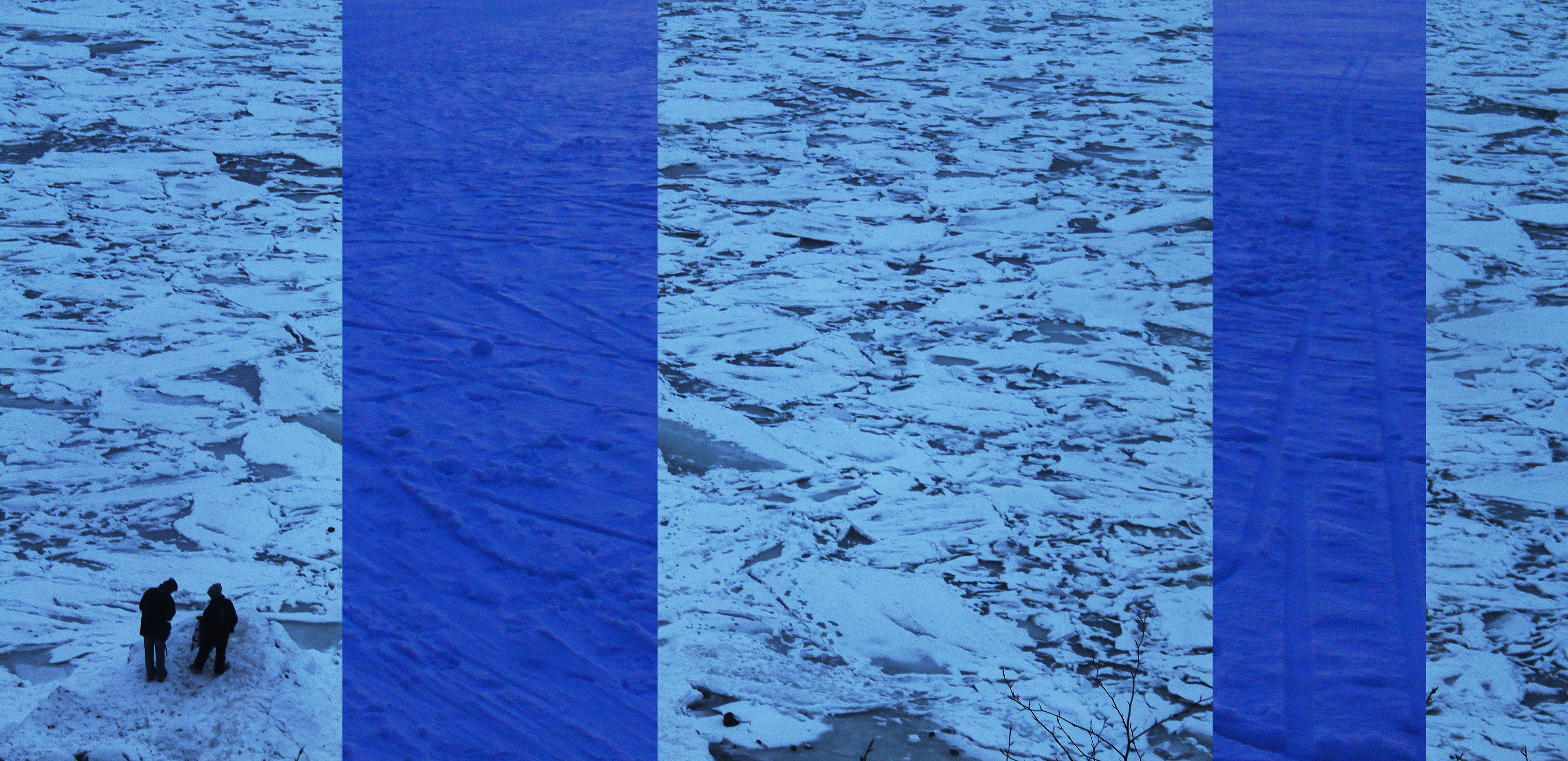 Photographs taken from the same location are juxtaposed against each other. This shows the variety of texture and color you can find in the same place: soft and hard, solid and melted, vivid and overcast.