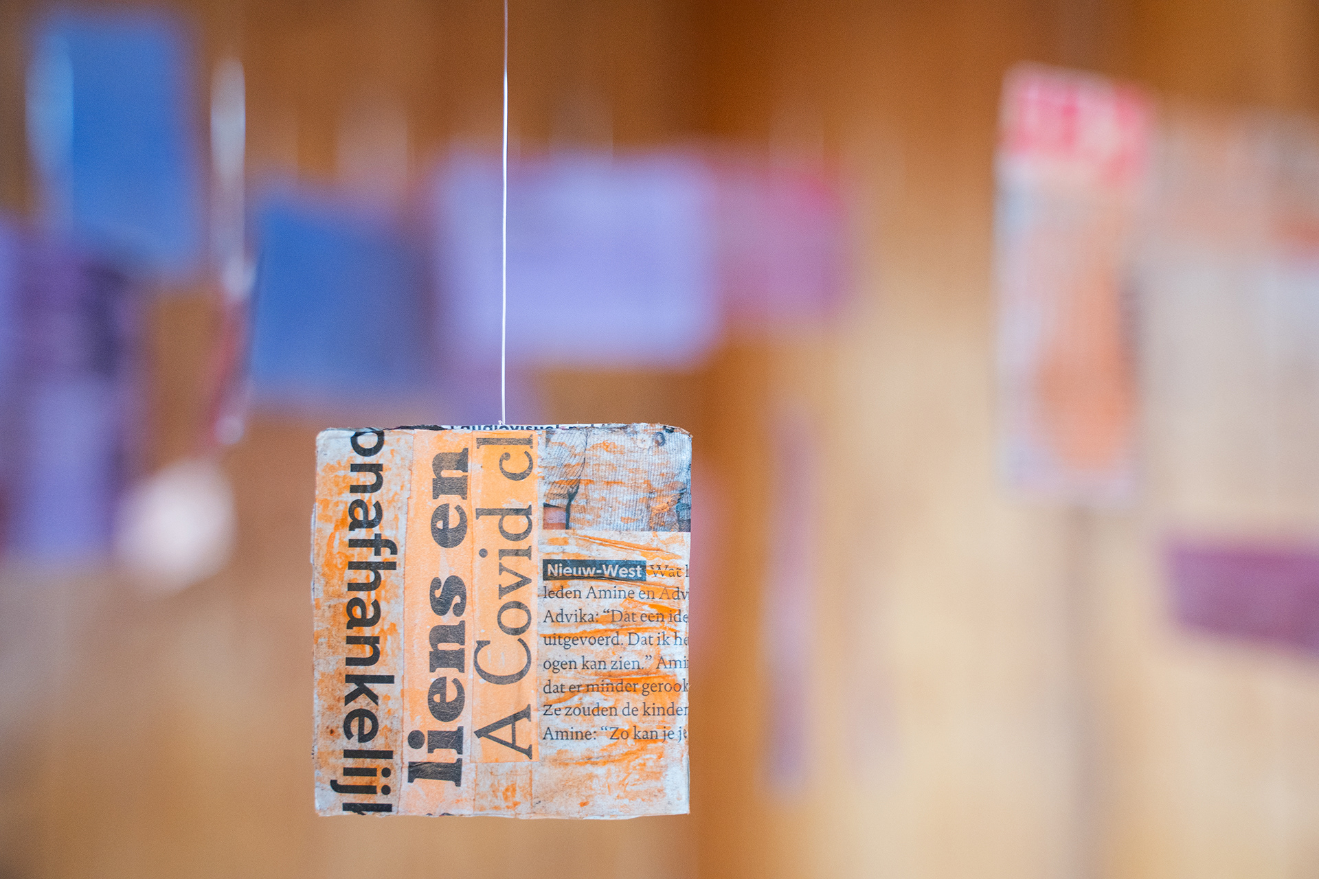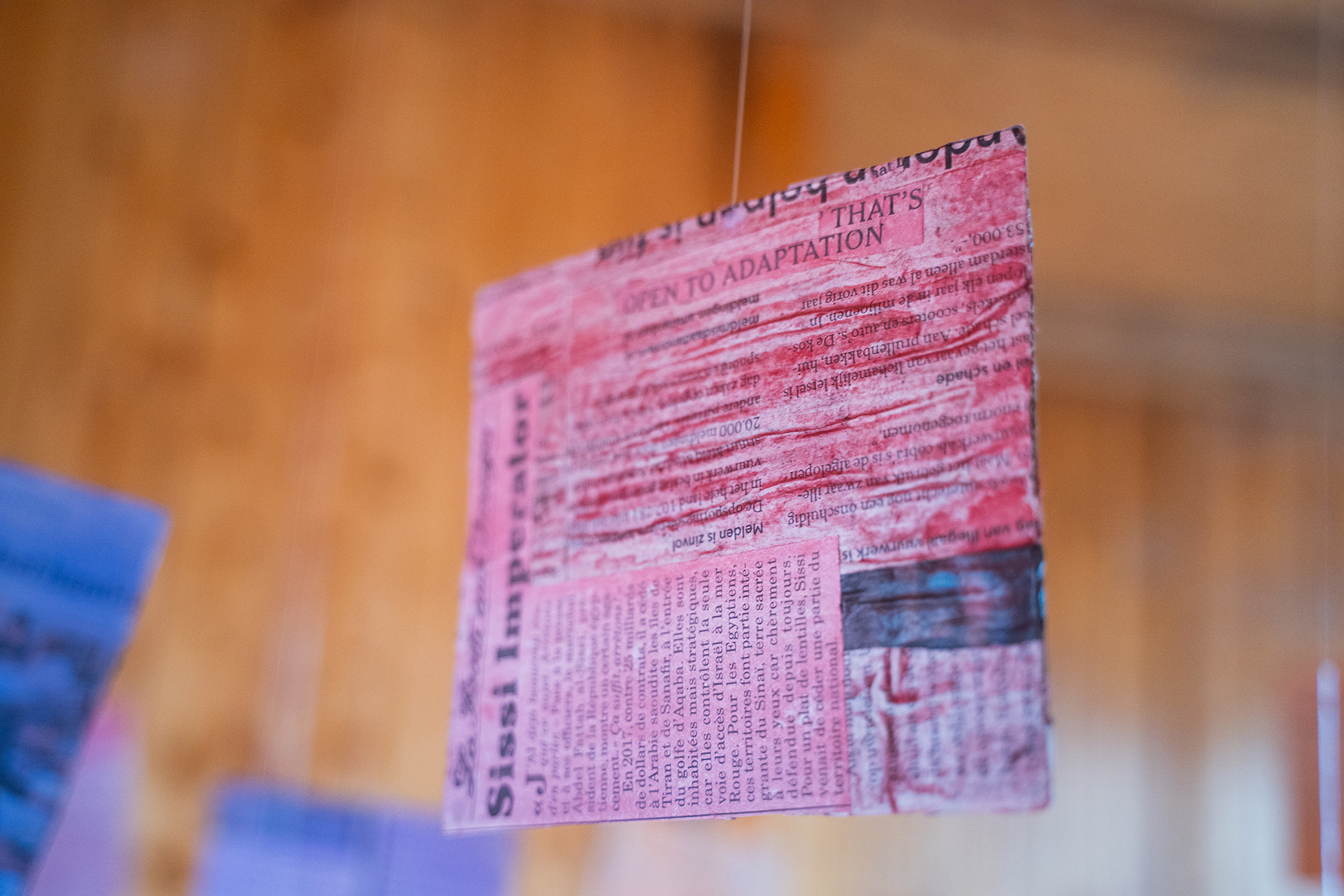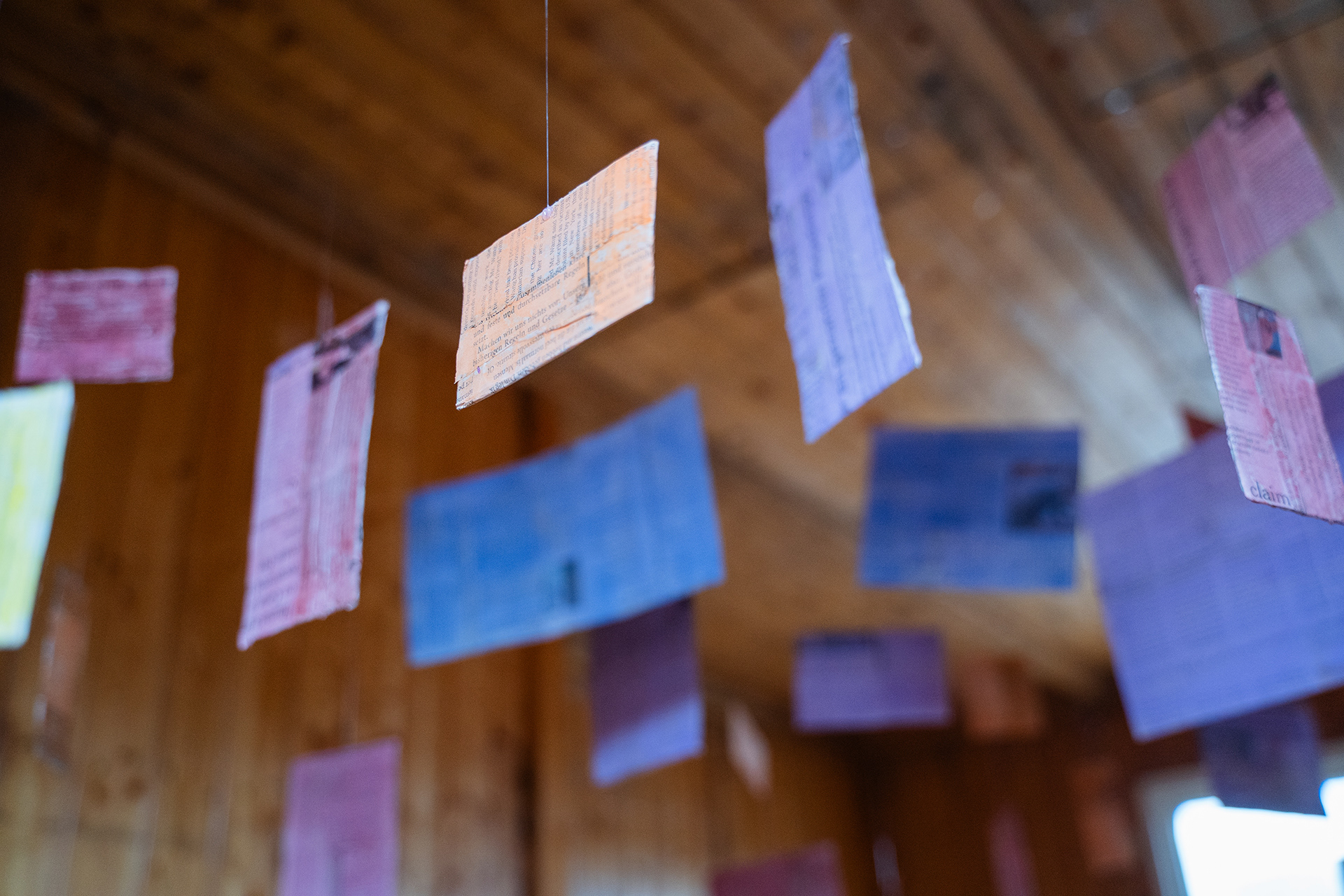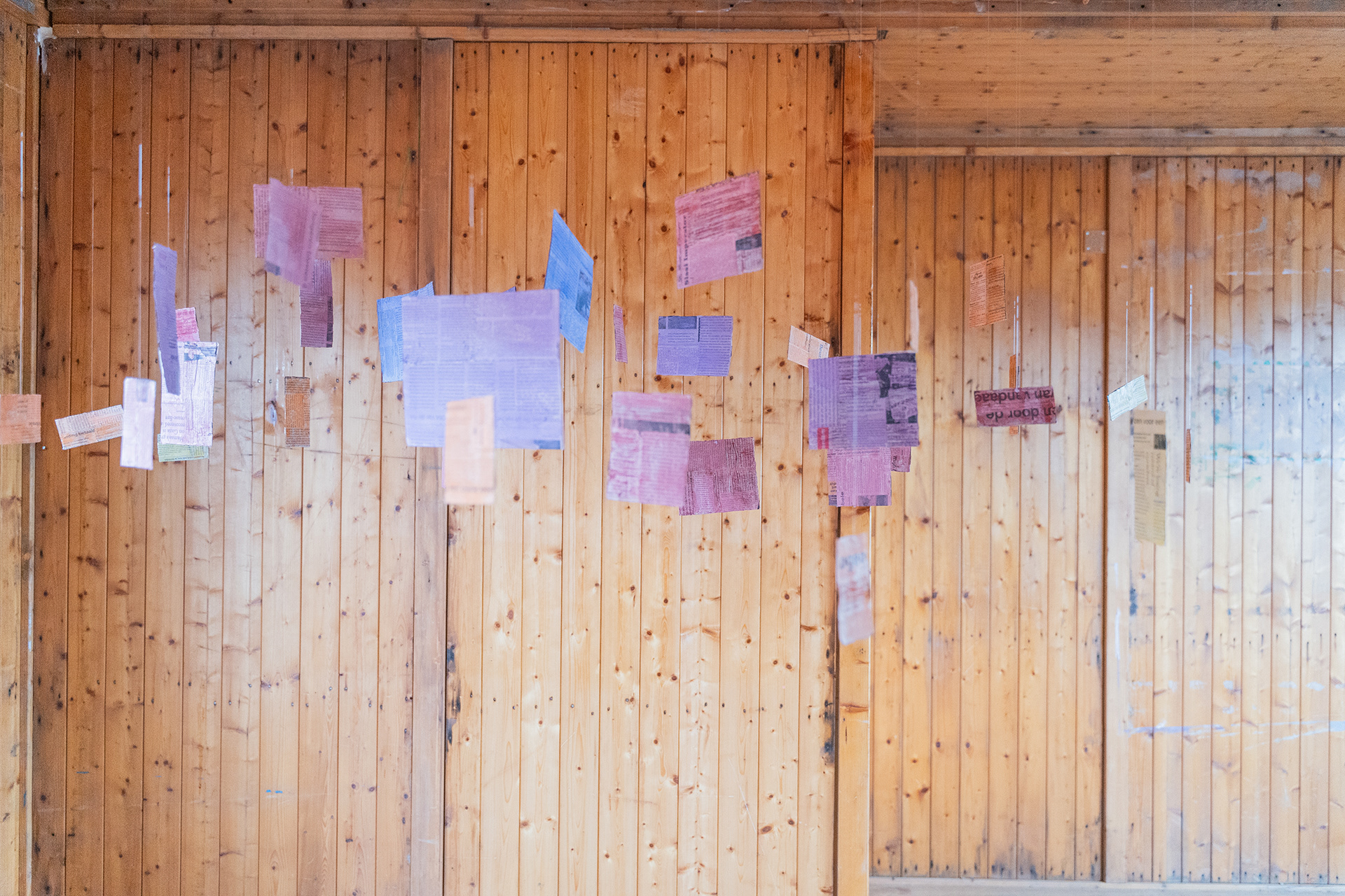 The installation Suspended Archive is inspired by Jorge Luis Borges's short story Library of Babel, where inhabitants of a library are surrounded by books that all seem to be written in gibberish. Similar to Borges's universe, the Suspended Archive squares seem to be hovering decipherable words, but when looking closely the viewer sees that each square contains multiple layers of newspapers in different languages underneath the colors.