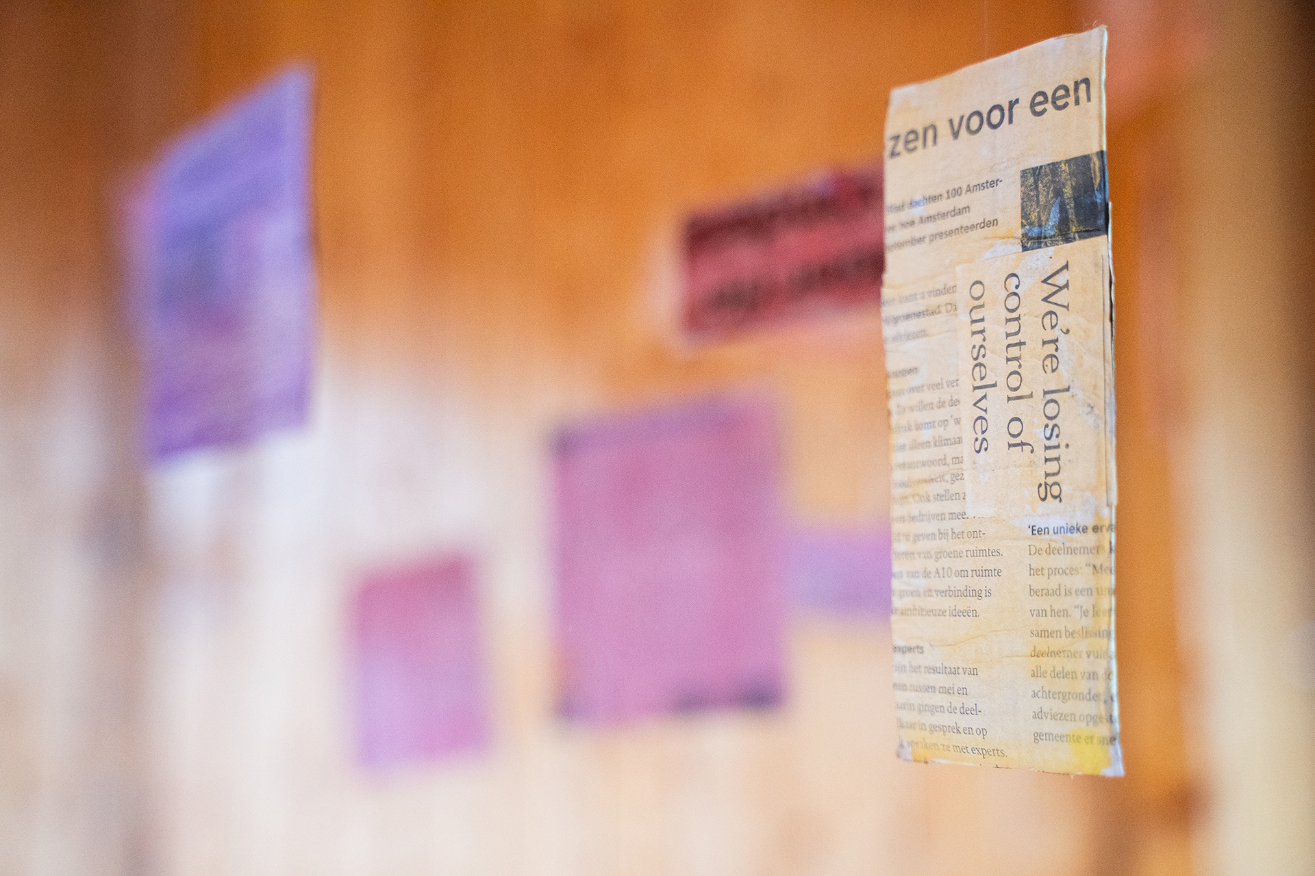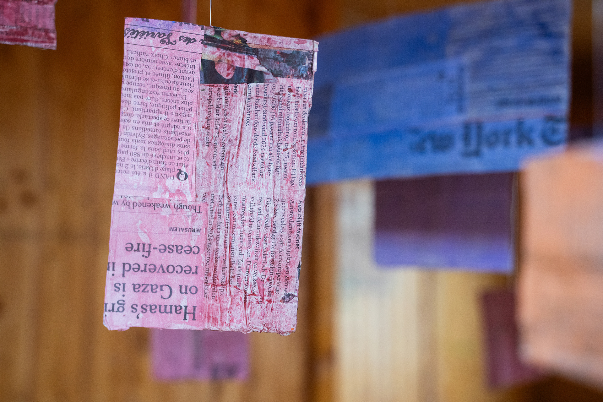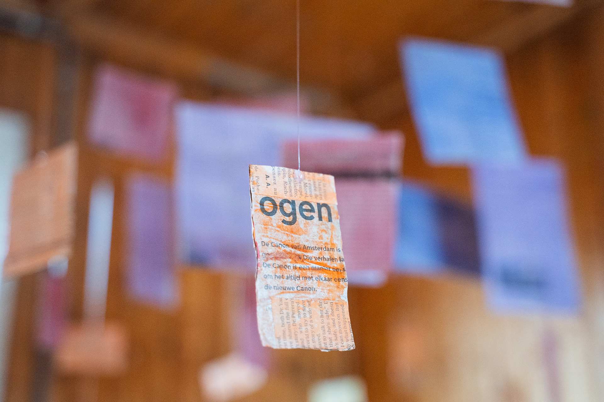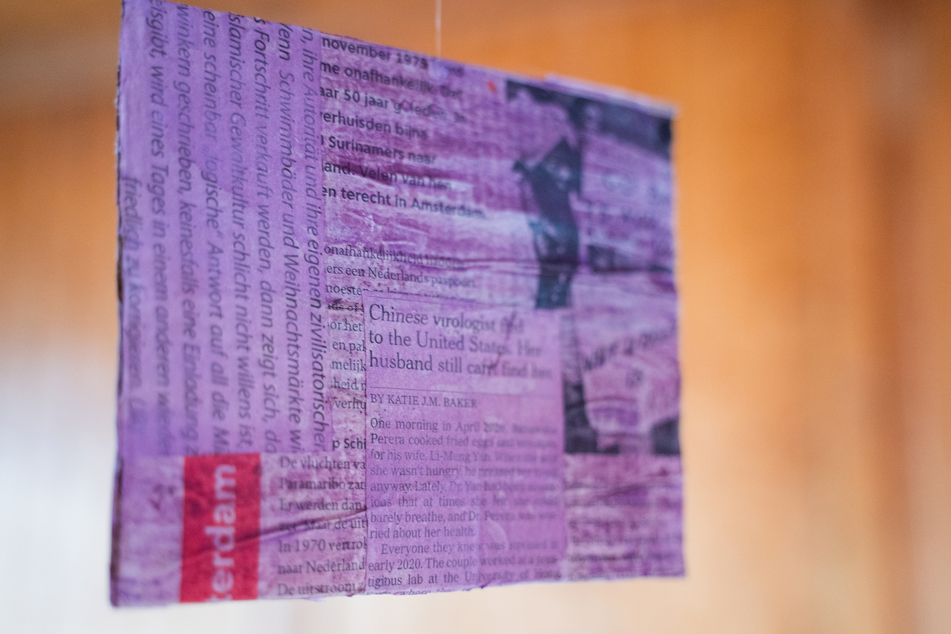 The installation Suspended Archive is inspired by Jorge Luis Borges's short story Library of Babel, where inhabitants of a library are surrounded by books that all seem to be written in gibberish. Similar to Borges's universe, the Suspended Archive squares seem to be hovering decipherable words, but when looking closely the viewer sees that each square contains multiple layers of newspapers in different languages underneath the colors.