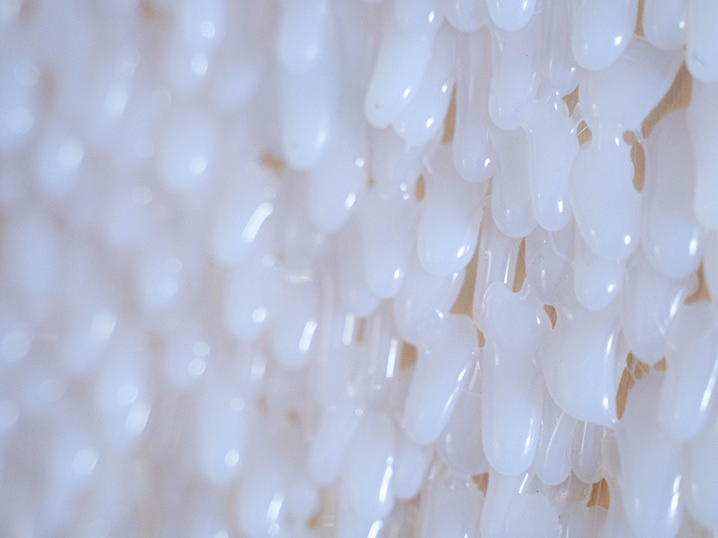 Wanting to test out a new material, I used a holographic sticker as the (literal) highlight of my next mural design. I kept the circular shape from the previous design, but I enlarged it. I then added mountains and a moon, all in a grey color palette so the holographic river would really stand out. Initially the sticker was a very flat layer that felt contrasting to the rest of the mural. But after one day of rain, it shrunk and took on the texture of the wall behind it. This actually gave the water a more realistic texture, blending it more naturally into the whole wall design. It's funny how sometimes accidents can enhance an artwork. It's important to stay open and flexible to adapt work as it evolves.